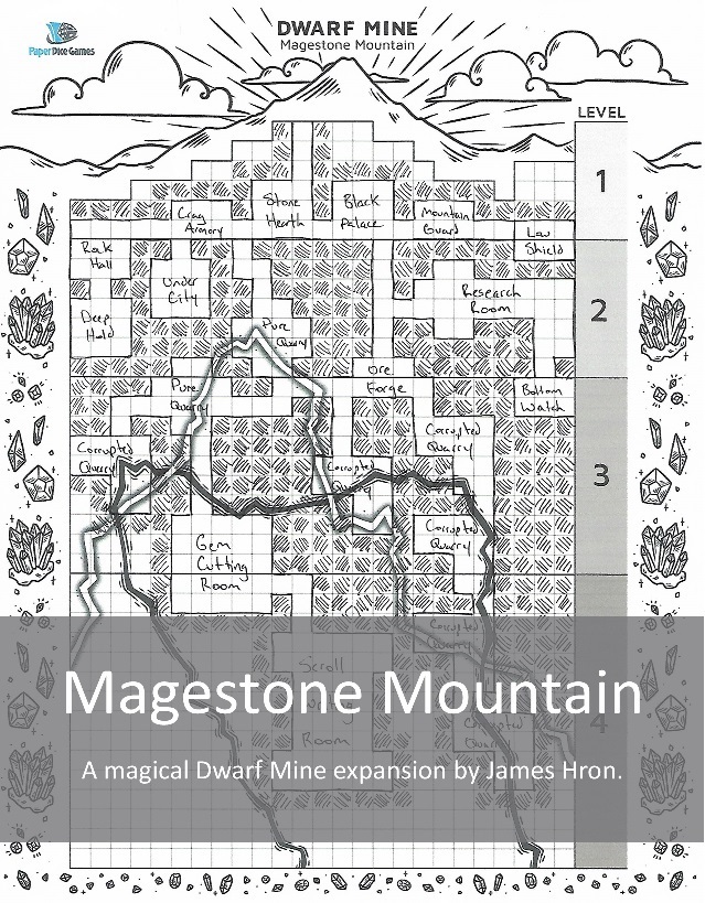 The Magestone Mountain Expansion includes: A brand new Dwarf Mine map, A spell list for casting spells, 4 new rooms for your Dwarf Mine, 4 new final bosses to fight, 4 new Treasure Tables (one for each mine level), 4 new Combat Tables (one for each mine level), New mechanics unique to this map